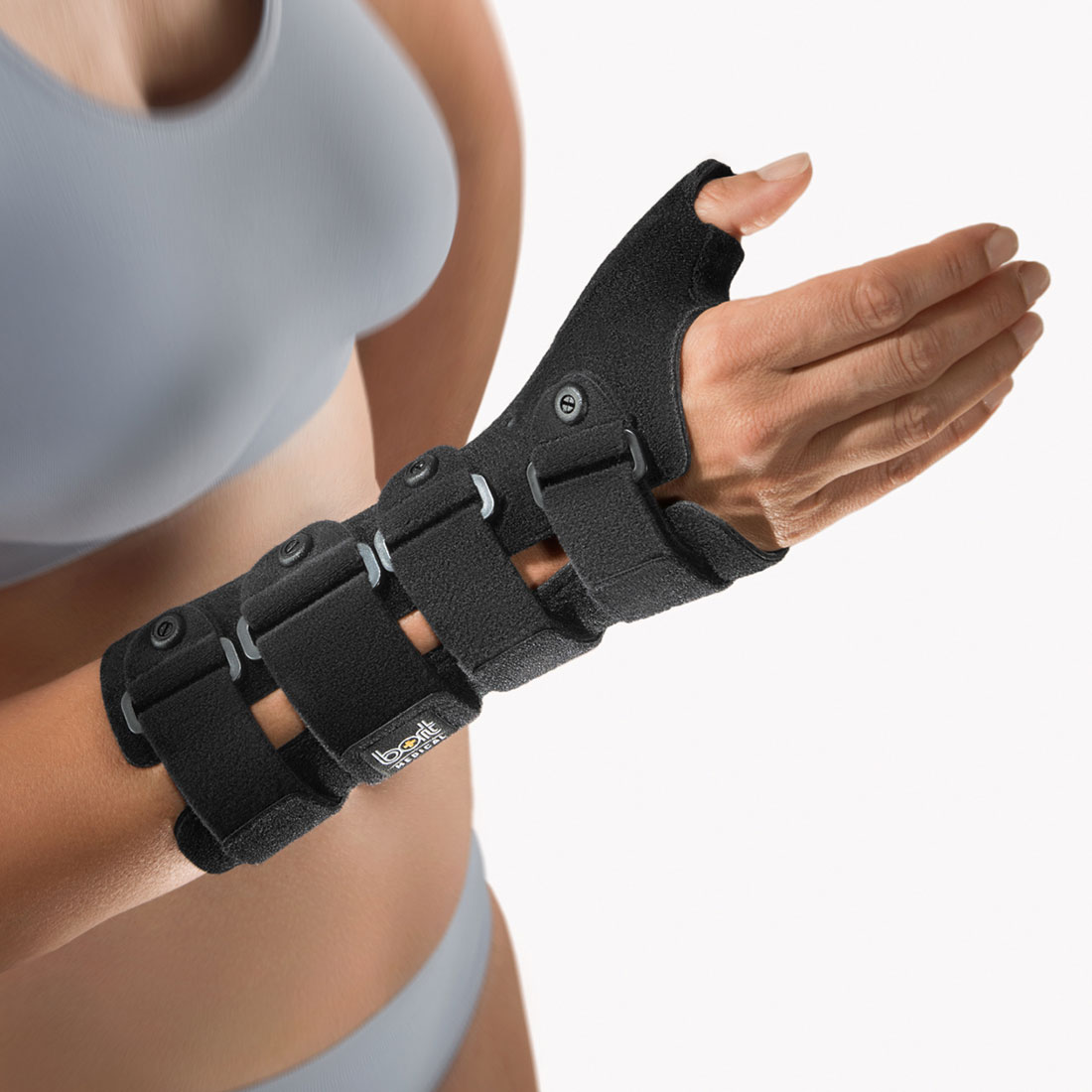 - Rondom grijpende polsbrace voor veilige immobilisatie van het polsgewricht, het metacarpofalangeale gewricht en het zadelgewricht van de duim